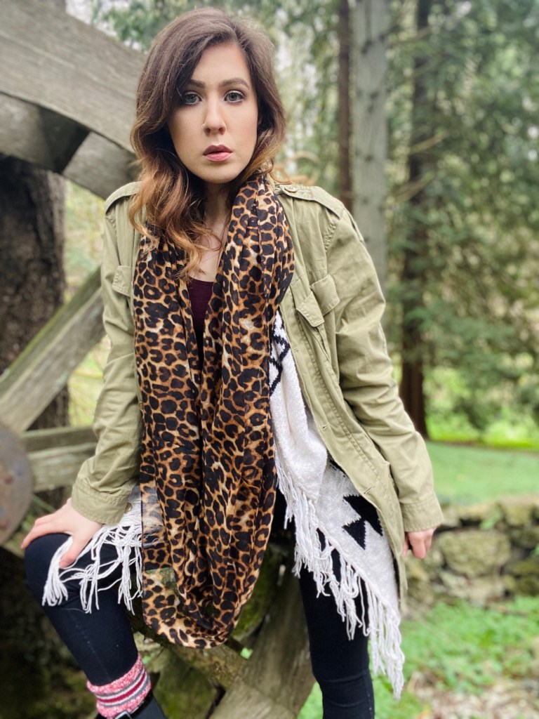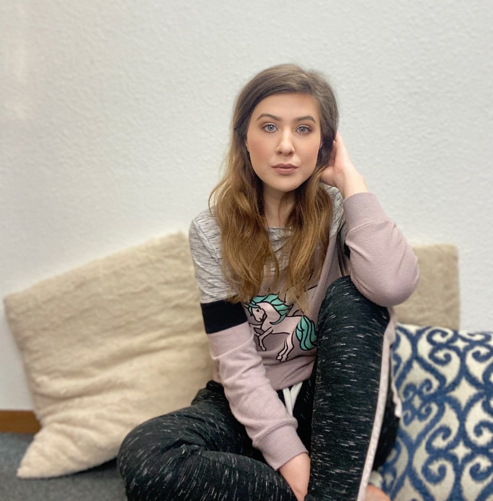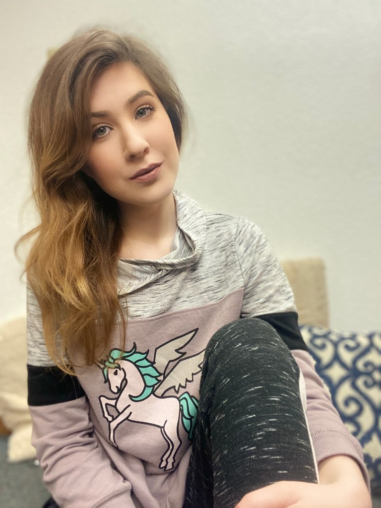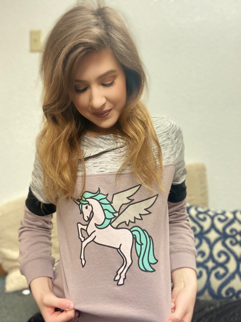 The shirt I chose for this snugly ensemble brings out my inner child by sporting a sparkly pink unicorn! Is there anything better? I love unicorns and sparkles, and really anything fantasy related. For me, this shirt makes me feel warm and fuzzy on the inside and the outside. I also love the muted pinky-purple color of it, and the heather grey on the upper part of the shirt. My pants, which are jogger types sweats, which are also heathered, but in black. I love this shirt and pants combo because they both have similar color schemes. The black cuffs on the sleeves of the shirt match the black of the sweats, and the light pink sides of the pants match the color of the unicorn on the shirt. I like that these colors are light and sort of pastel but don’t necessarily remind me of Easter eggs or marshmallow peeps. It’s a simple outfit that’s easy to move in and will be comfortable throughout the day spent at my house. If I’m feeling really snugly I’ll add some fluffy socks but for today they weren’t necessary. If I was going to go out somewhere to run and errand or something, I’d simply grab my favorite black and white Fabletics sneakers, and a black coat and be able to run out the door easily.
